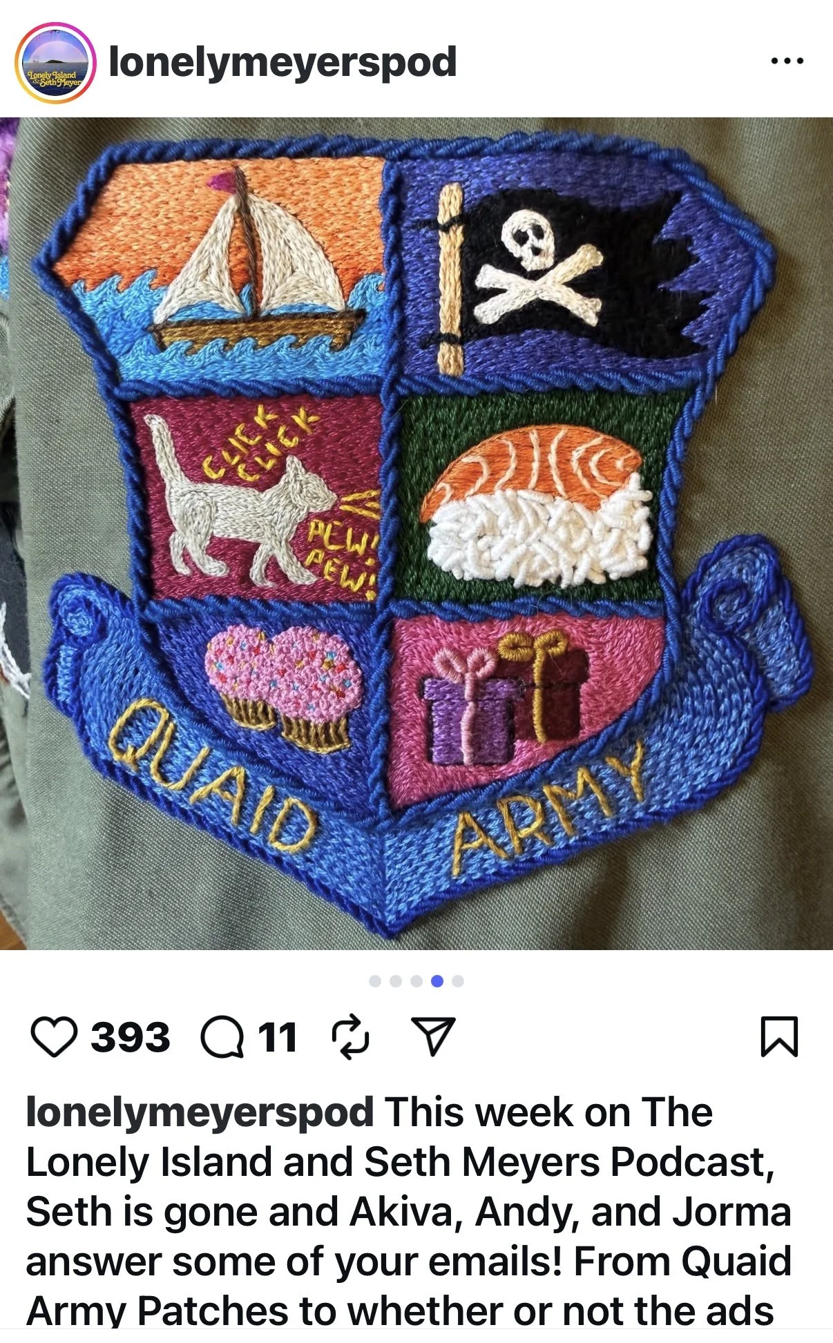 This podcast has brought me great joy. Listening to these 4 friends just trying to make each other laugh has been good for my soul. To be mentioned on it is a thrill! I wear this patch proudly.