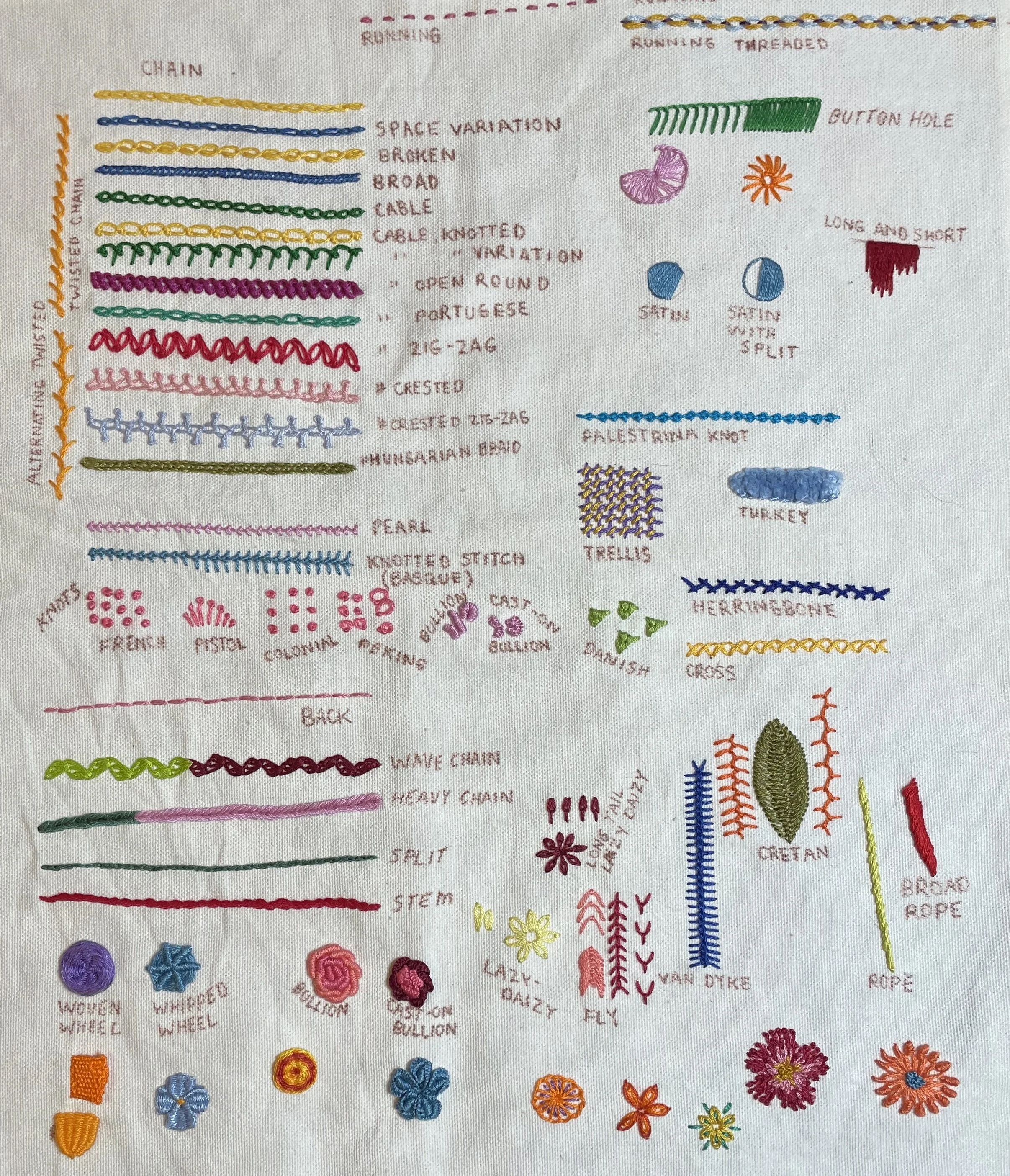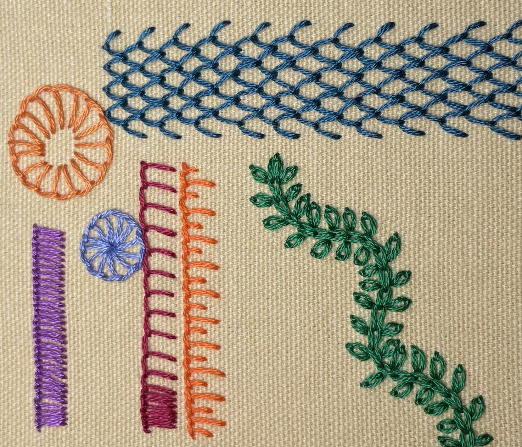 Learn the basic stitches without the added pressure of following a design. There are 100’s of stitches that are related by stitch structure.